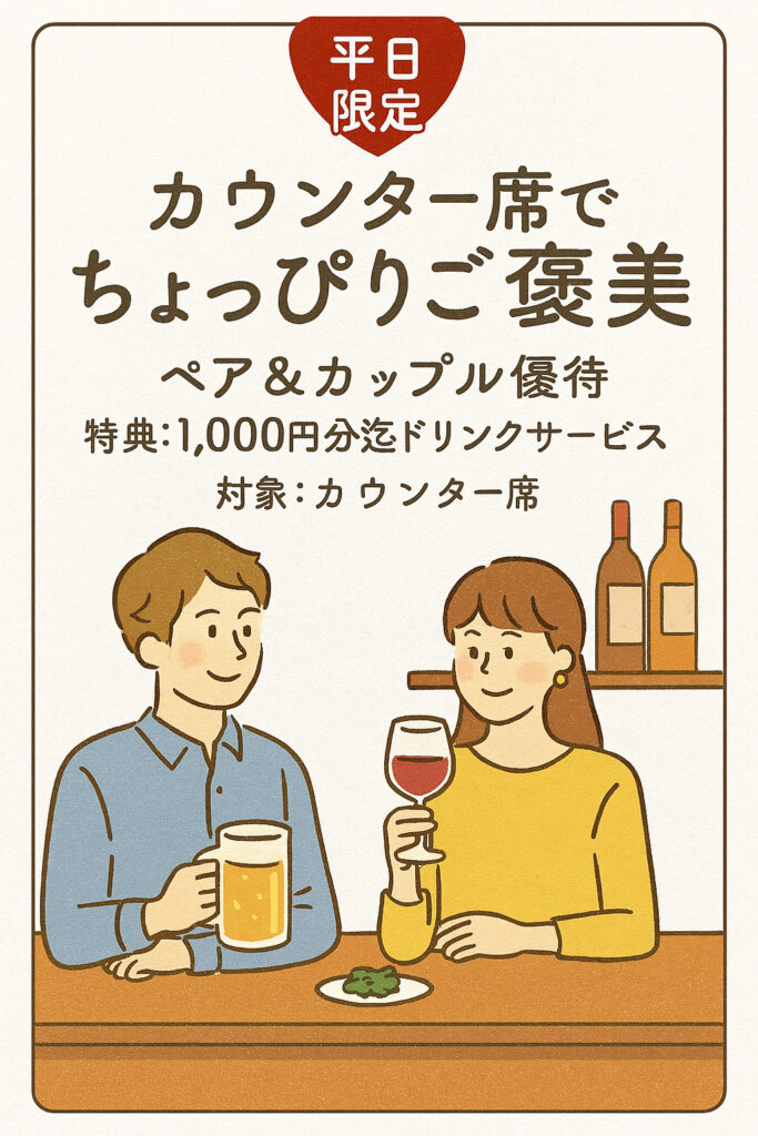 対象:カウンター二名一組ご利用 ご利用総額 総額6,000円以上で
